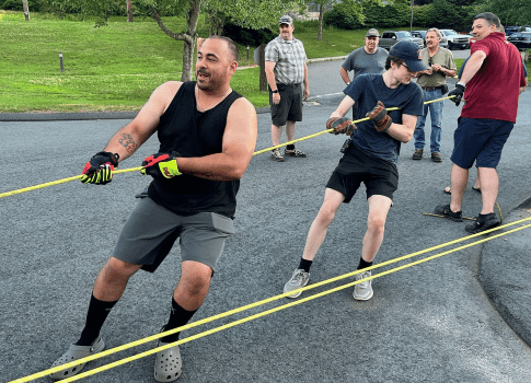 They then went outside and set up a 3:1 haul system using a pulley and rope to let members feel the difference with mechanical advantage, as opposed to using their own strength.