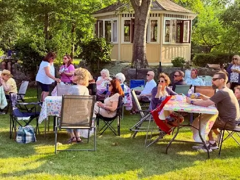 (June 12, 2025) — On a perfect evening, in a perfect setting at School Marm’s Farm Orchard and Trails, Ellen and William Oppenheimer hosted a Killingworth Community Fund celebratory picnic on June 5, 2025. The event was generously sponsored by Turnbridge/CT Clinical Services, Killingworth; WJ Financial Advisors; Cloutier & Cassella, Attorneys at Law; the Connecticut Burns Care Foundation; Lover’s Lane Farm/Michele Sokoloff; Janice and Jerry Markham, and Connecticut Water Services, Inc..