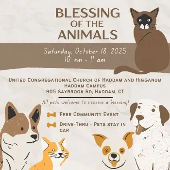 (September 20, 2025) — On Saturday, October 18, 2025, from 10:00 a.m. to 11:00 a.m., the United Congregational Church of Haddam and Higganum (UCCHH) will hold a Blessing of the Animals event at their Haddam Campus, located at 905 Saybrook Road in Haddam.