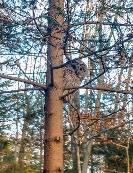 (October 13, 2025) — Karen Gagliardi of Killingworth submitted this photo of a barred owl taken several years ago on Parker Hill Road. It stayed there for several weeks and then moved on.