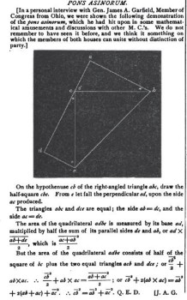 It was at Mount Holyoke that Mrs. Oates developed an appreciation for Garfield, not in a history or a political science class, but in her study of geometry. Garfield, you see, was a brilliant mathematician who published an important paper in April of 1876 in the New England Journal of Education about a proof called the “Pons Asinorum.”