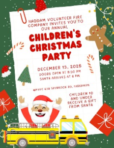(November 25, 2025) — Santa Claus is coming to town! On Saturday, December 13, 2025, the Haddam Volunteer Fire Company and the HVFC Auxiliary will host their Annual Children’s Christmas Party at the firehouse!
