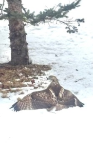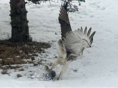 “Yesterday, while I was eating lunch, out of the corner of my eye I detected a sudden movement. I stood up and looked out the window. A large, red-tailed hawk had just swooped in and captured a gray squirrel, which was attempting to raid our bird feeders.