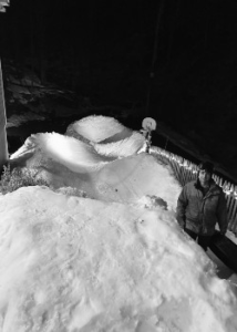 Some of the towering snow walls rise more than seven feet, dwarfing the former HKHS math teacher (photo above). Needless to say, Tim and his family have spent plenty of time outdoors this winter. There’s just one rule that the builder and his wife insist on: every rider wears a helmet.