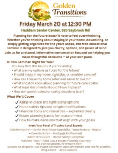 (March 7, 2026) — A free educational seminar on aging-in-place, downsizing options, home safety, and future planning will be held on Friday, March 20 at 12:30 p.m. at the Haddam Senior Center.